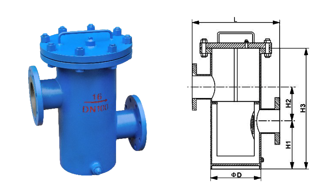 高低籃式過濾器主要由進(jìn)出口的接管和法蘭、筒體、濾籃、筒體法蘭、筒體法蘭蓋及緊固件等組成。當(dāng)液體通過進(jìn)口進(jìn)去筒體流經(jīng)濾籃后,固體雜質(zhì)顆粒被阻攔在濾籃內(nèi),而潔凈的流體通過濾。
